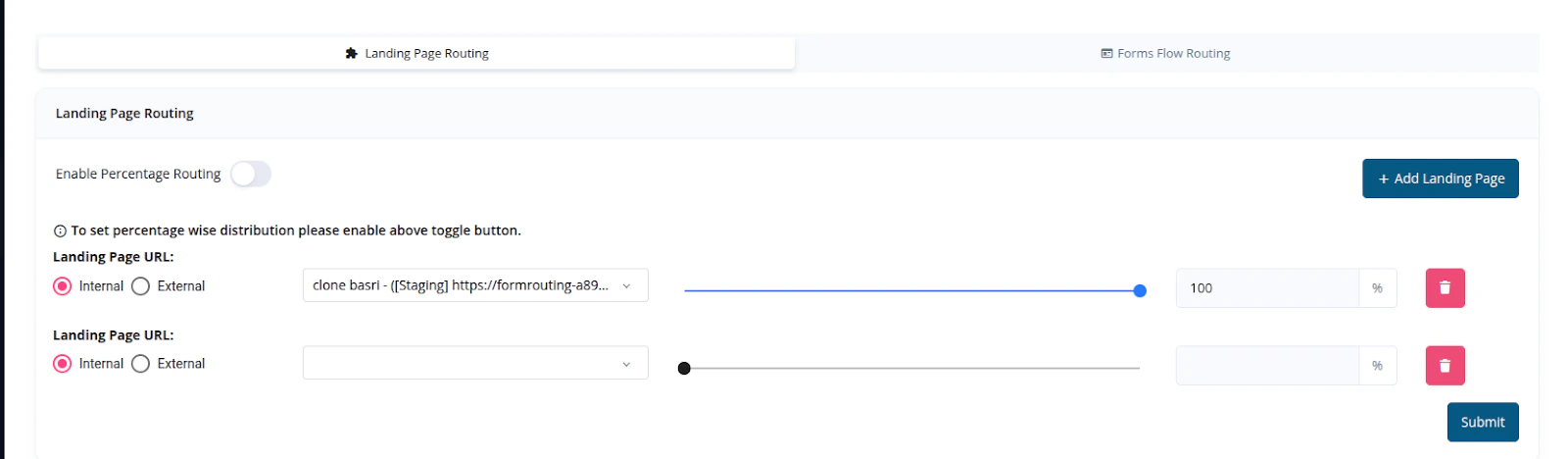 Landing Page Routing allows you to distribute incoming traffic between multiple landing pages by setting custom percentage splits. You can send users to internal system-hosted pages or to external URLs.