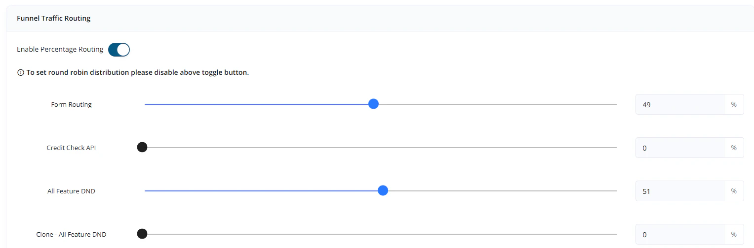 When toggled ON, traffic will be divided based on the percentage settings. Disable Percentage Routing: